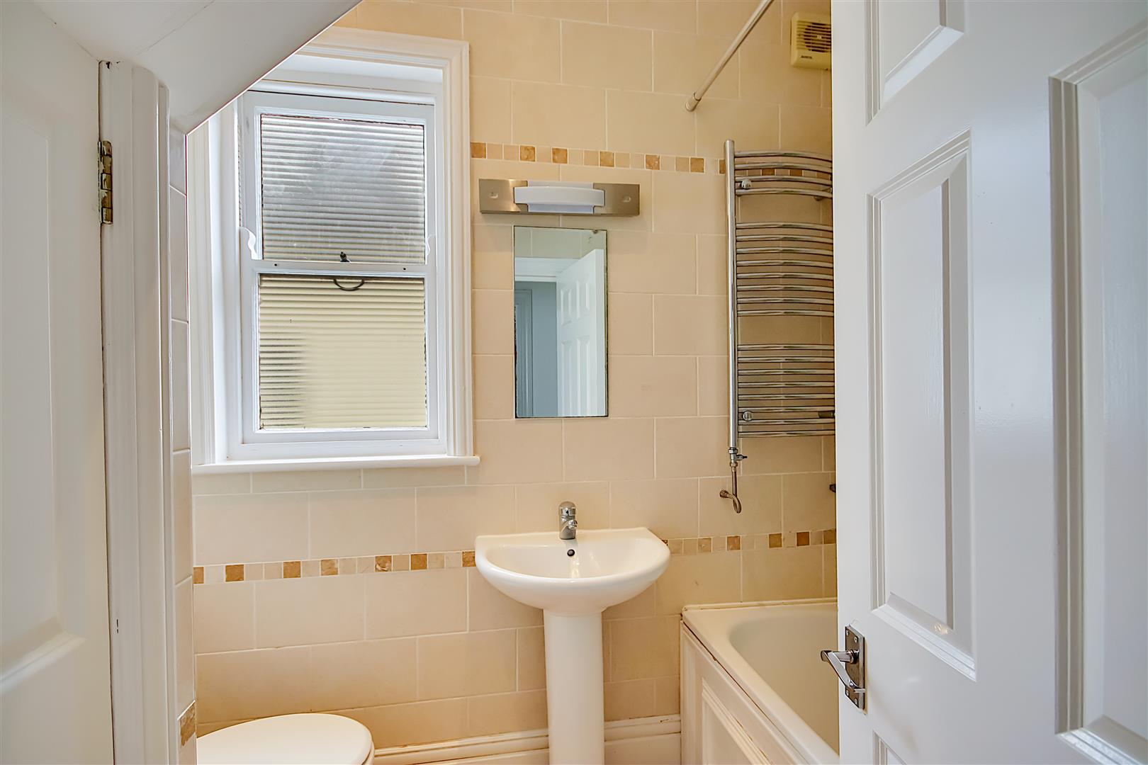 Panelled bath with mixer taps. Push button w/c. Wash hand basin with mixer taps. Ladder style radiator. Wall mounted 'Worcester' boiler. Tiled walls. Obscure glass sash window. Cupboard with space and plumbing for washing machine.