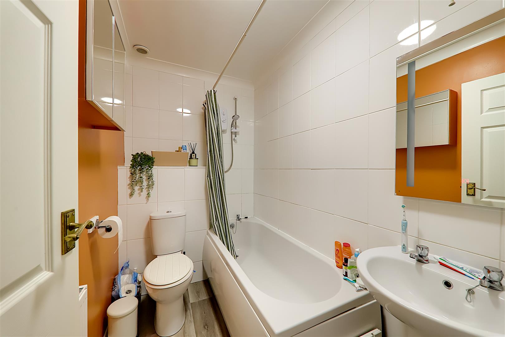 Vinyl flooring, panel enclosed bath having a wall mounted electric shower over, low flush WC, pedestal hand wash basin with hot & cold taps, part tiled walls, wall mounted de-misting mirror, wall mounted vanity unit with mirrored front, radiator, skimmed ceiling.