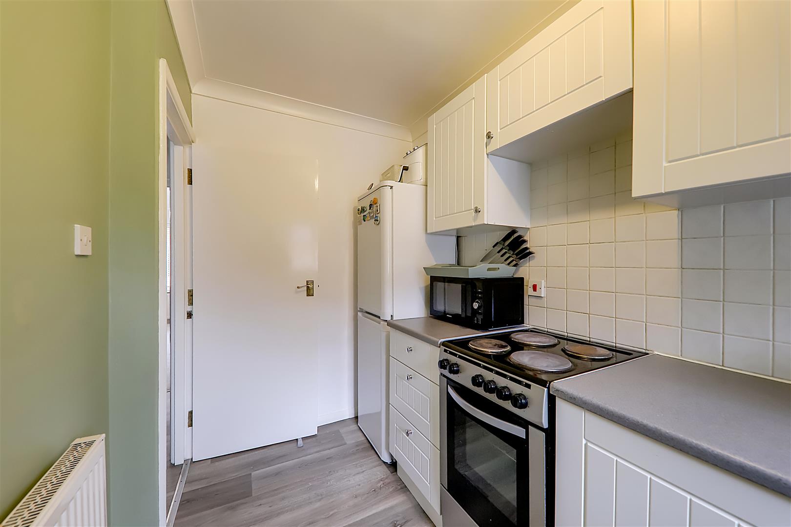 Vinyl flooring, security telephone entry system, wall mounted electric fuseboard, skimmed ceiling.
