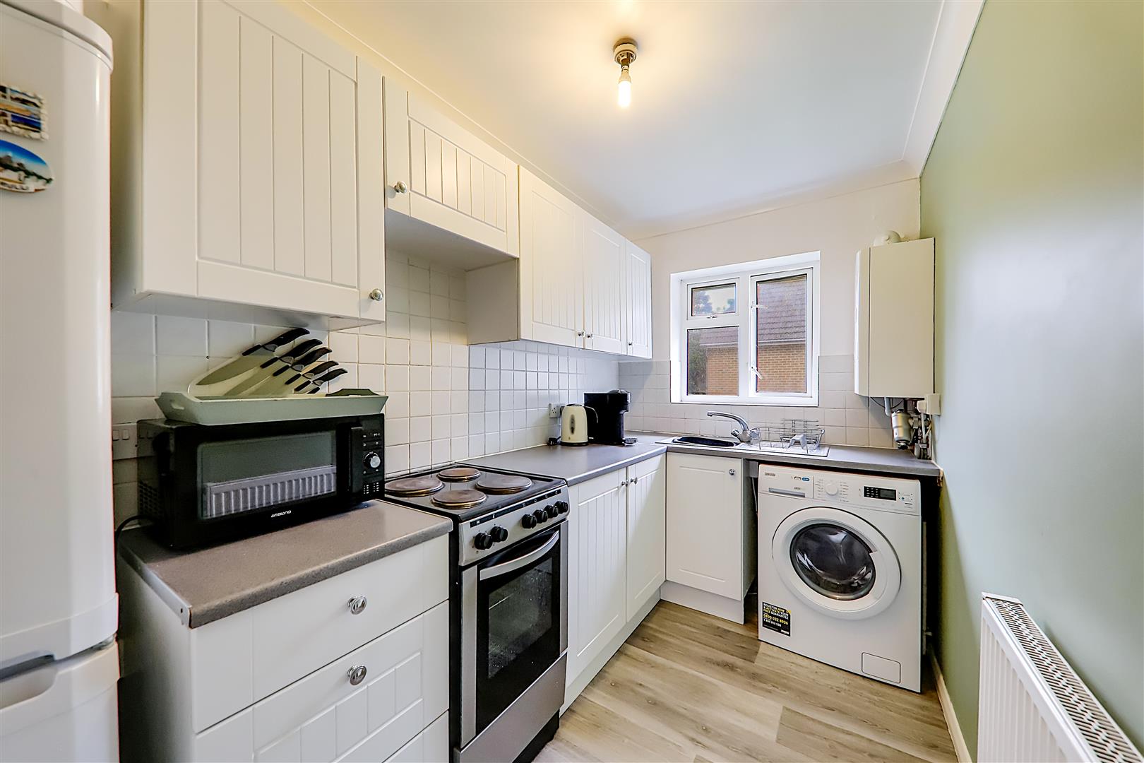Vinyl flooring, roll edge laminate work surfaces with cupboards below & matching eye level cupboards, space for oven, washing machine & fridge freezer, inset stainless steel single drainer sink unit with mixer tap, tiled splashback, wall mounted combination boiler, radiator, PVCU double glazed window, skimmed ceiling.