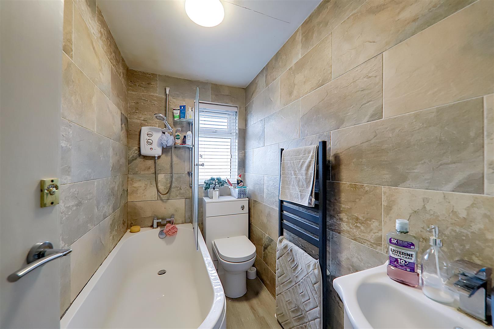 White suite comprising panelled bath with mixer tap, glazed shower screen, and electric Triton shower. Vanity unit having washed hand basin and mixer tap with cupboard below. Concealed cistern WC. Tiled walls. Ladder style towel radiator. Double glazed window.