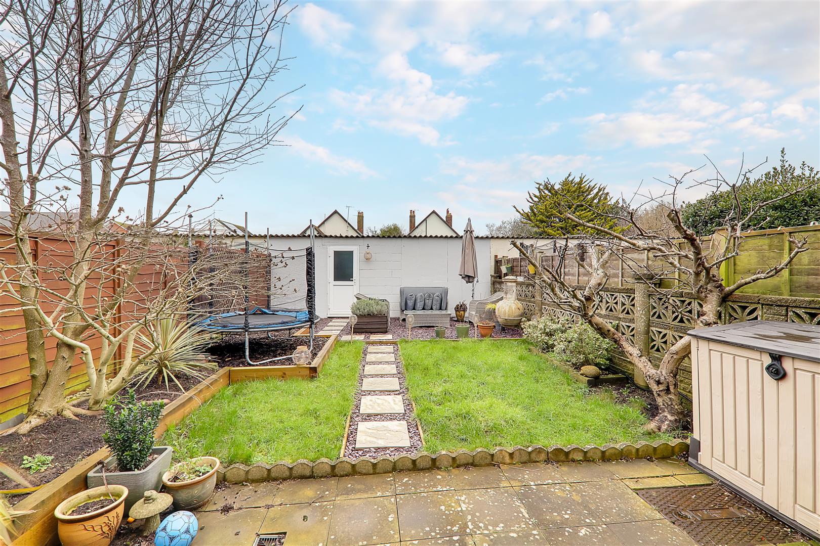 Paved patio area. Majority being paid to lawn. Separate slate laid patio. Fence surround. Access to garage via personal door. Access to front via side gate.