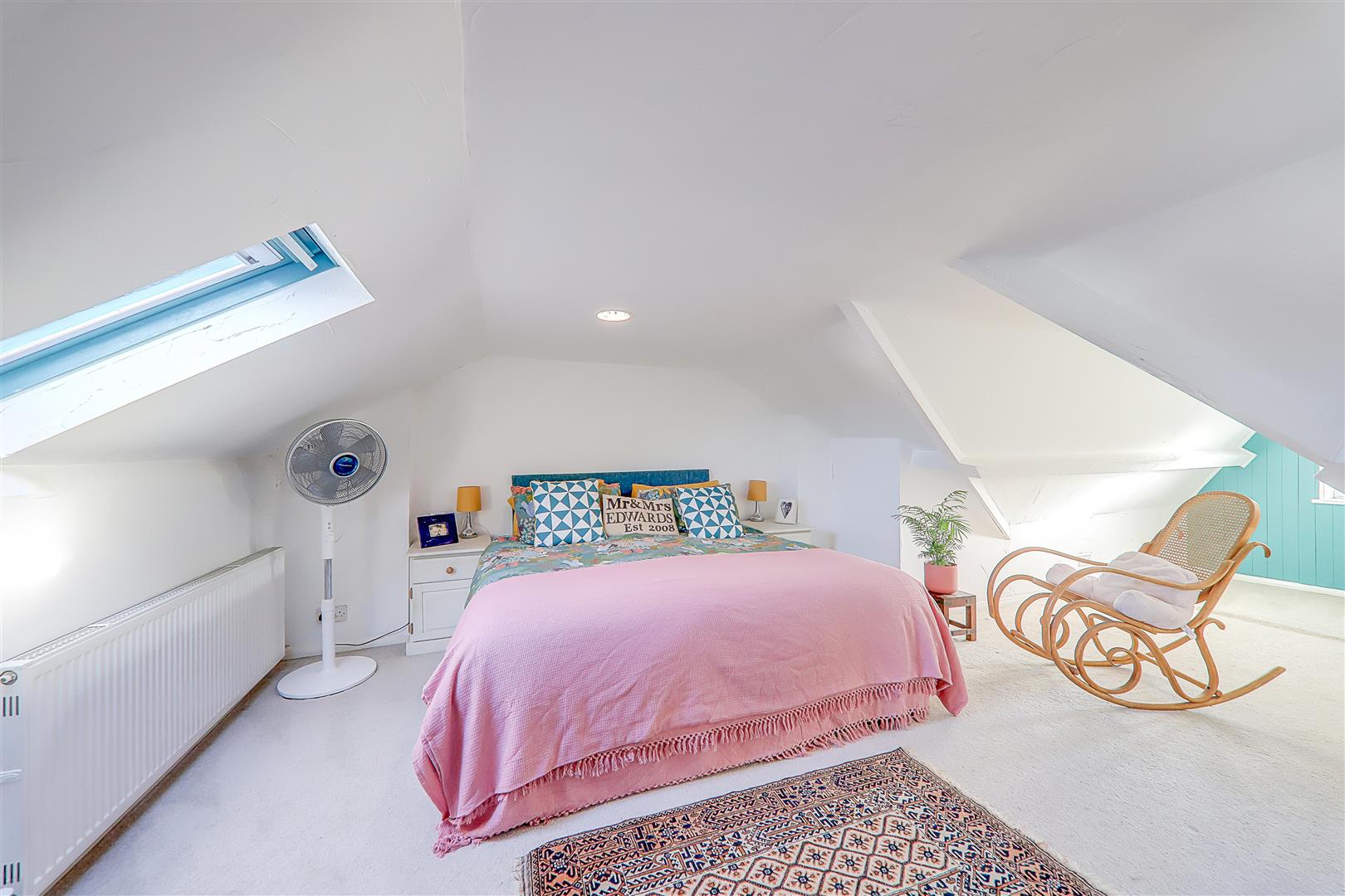 T shaped with maximum measurements 23'8 x 18'6. Radiator. Two Velux double glazed windows. Eaves storage cupboard.