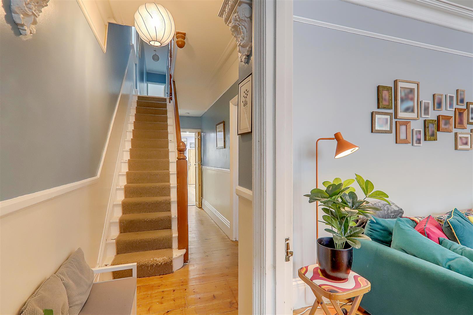 Stripped wood flooring. Understairs storage. Attractive balustrade. Radiator.