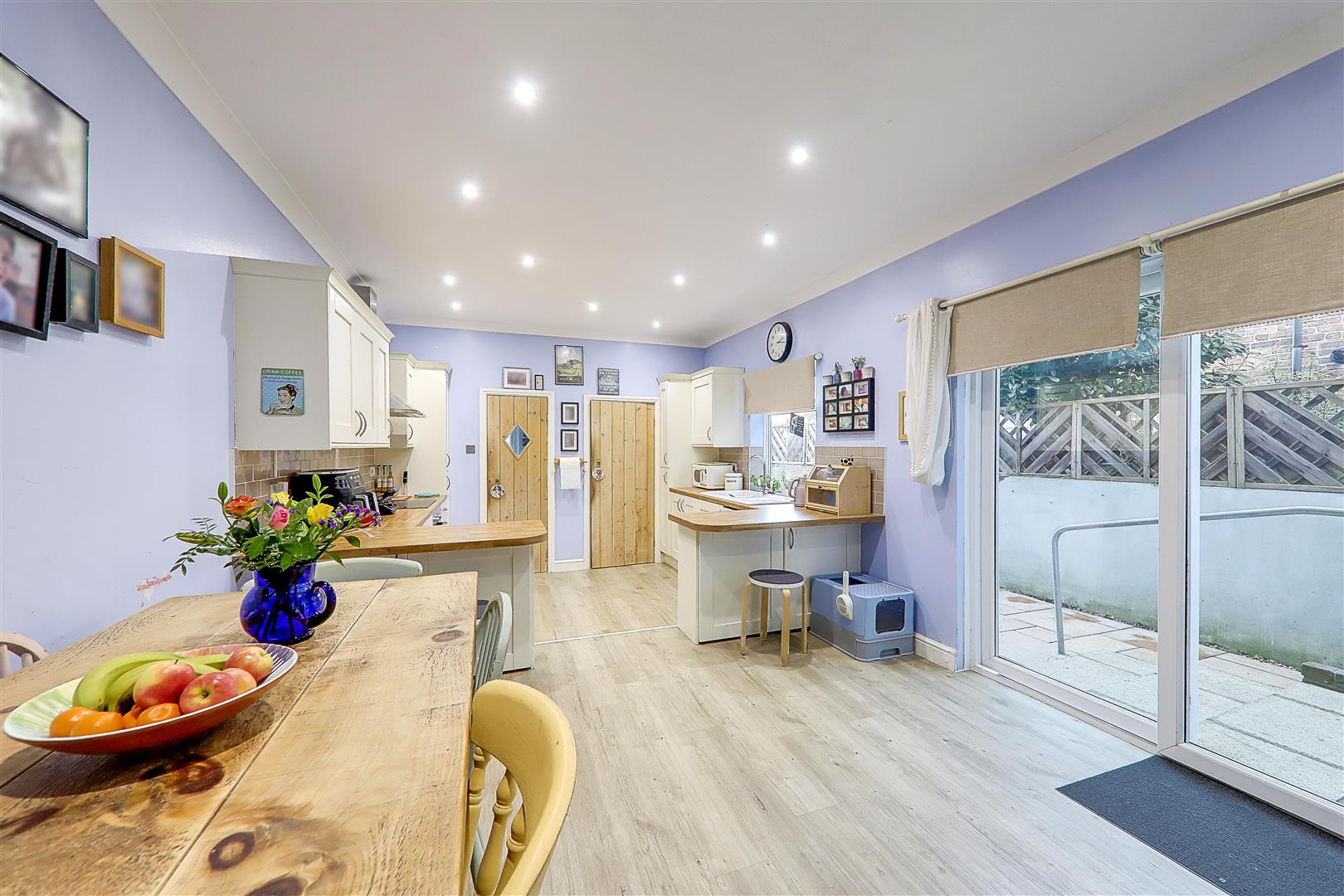 Modern fitted kitchen comprising work surfaces with 1.5 bowl sink and single drainer unit incorporating mixer taps. Excellent range of base units and matching wall units. Fitted oven with hob above and canopy extractor fan. Integrated dishwasher. Walk in larder currently housing a freestanding fridge/freezer. Double glazed window. Radiator. Double glazed sliding patio doors leading out to garden. Further door into: