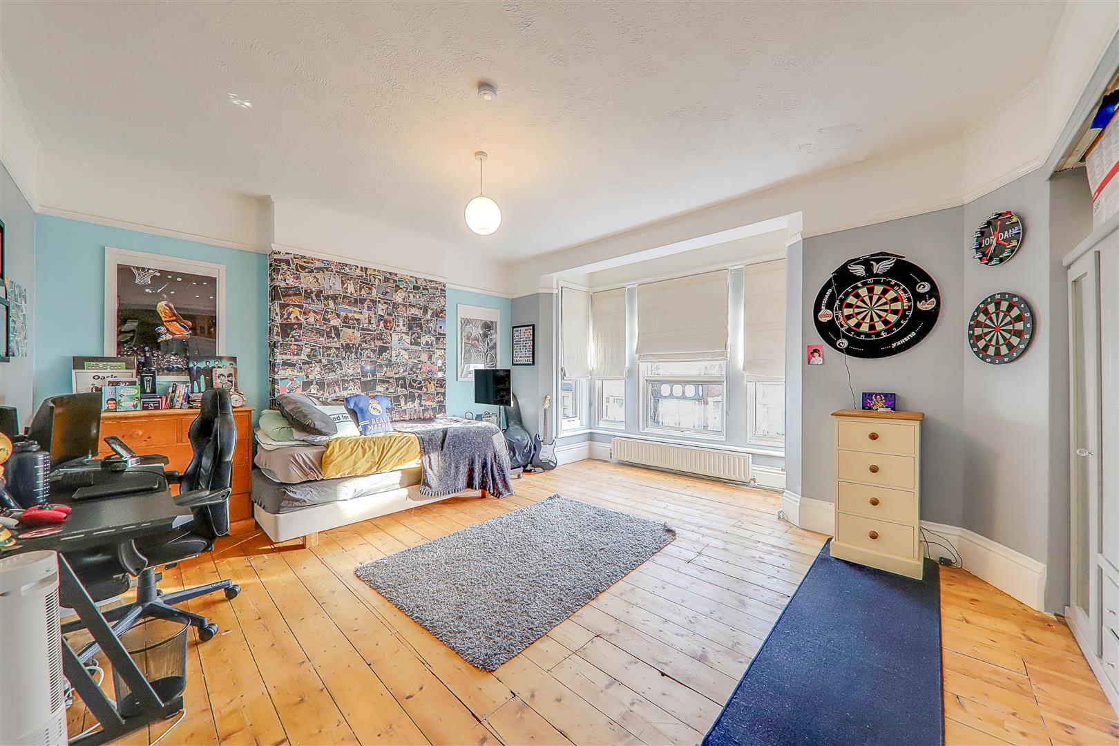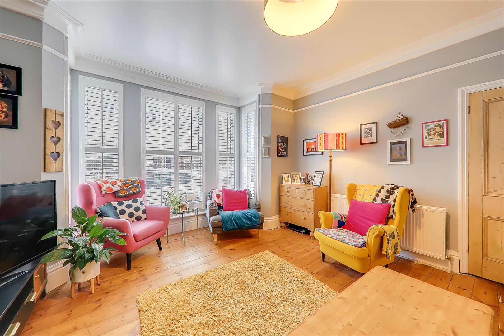 Attractive feature fireplace and surround. Double glazed south facing bay window with plantation shutters. Stripped wood flooring. Decorative cornice. Picture rail. Double radiator. TV and telephone point.