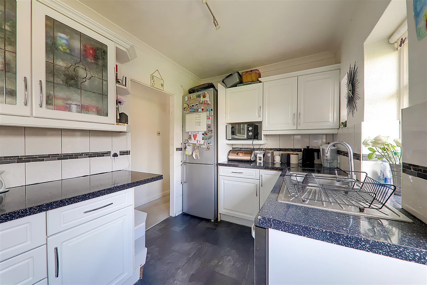 Square edge works surface having insect one and a half bowl stainless steel sink with mixer tap and draining board. Freestanding four ring cooker. Space for tumble dryer. Space for two fridge freezer. Matching range of cupboards, drawers and eyelevel wall units. Tiled splashback surround. Two double glazed windows. Double glazed door leading to staircase to garden.