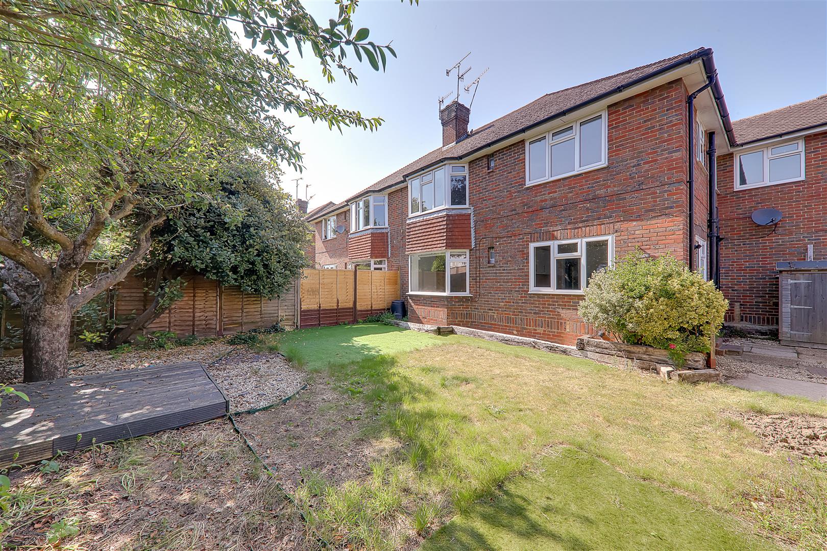 South facing rear garden being mainly laid to lawn, enclosed mostly by fencing with part artificial grass and raised decking area. Paved patio area. Gate to garage compound.