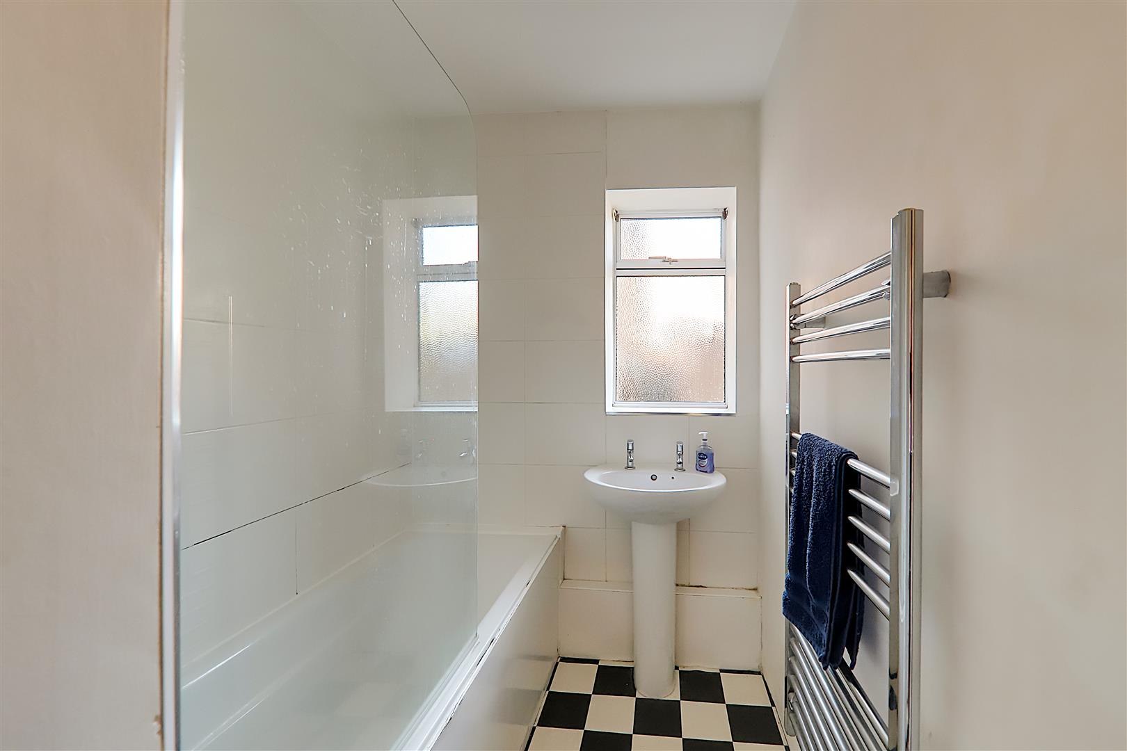 Comprising panelled bath with shower attachment and screen. Pedestal wash hand basin. Heated towel rail. Part tiled walls. Double glazed window.