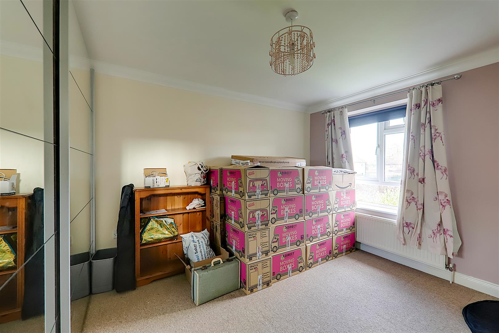 South aspect via double glazed windows. Range of fitted mirror fronted bedroom wardrobes. Radiator. Levelled and coved ceiling.