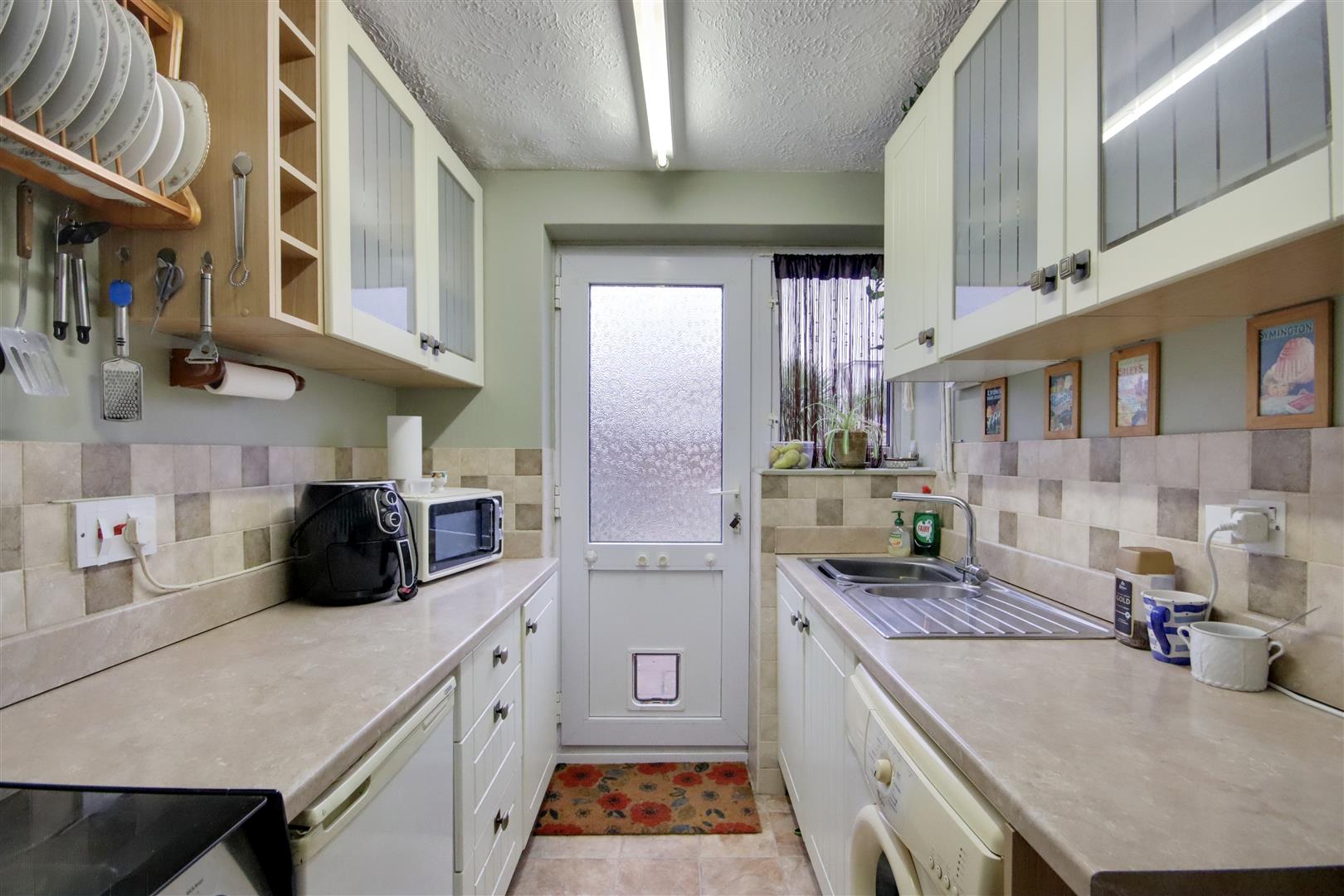 Modern kitchen with roll top work surfaces with inset one and half bowl single drainer stainless steel sink unit. Excellent range of base units with matching eye level wall units. Space and plumbing for washing machine. Space for tall fridge/freezer. Shelved larder cupboard. Understairs storage cupboard. Double glazed window and double glazed door to garden.