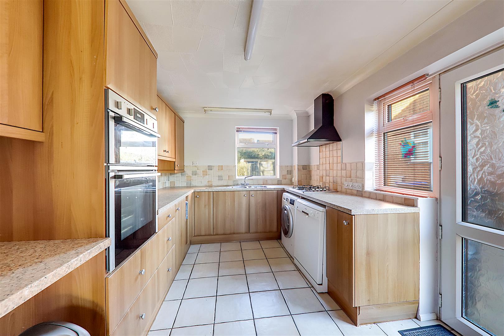 Range of work surfaces with cupboards and drawers fitted under. Radiator. Included Bosch dishwasher and washing machine. Built in Oven and grill. Double glazed window and double glazed door and window to side. Range of matching wall cupboards. Wall mounted boiler. Tiled floor.