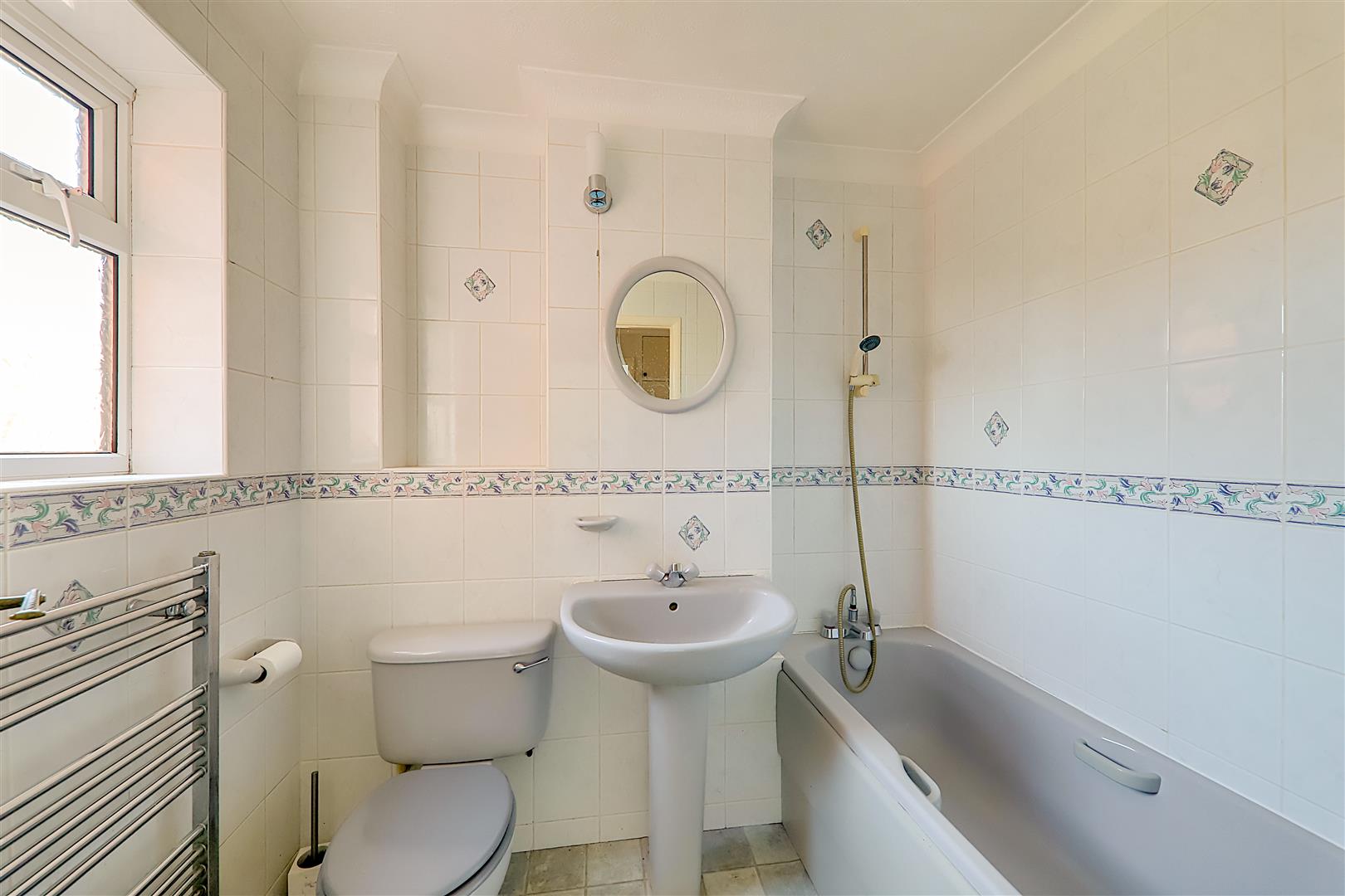 Suite comprising panelled bath with shower attachment, pedestal wash hand basin and low level flush WC. Wall mounted towel radiator. Double glazed window. Tiled walls.