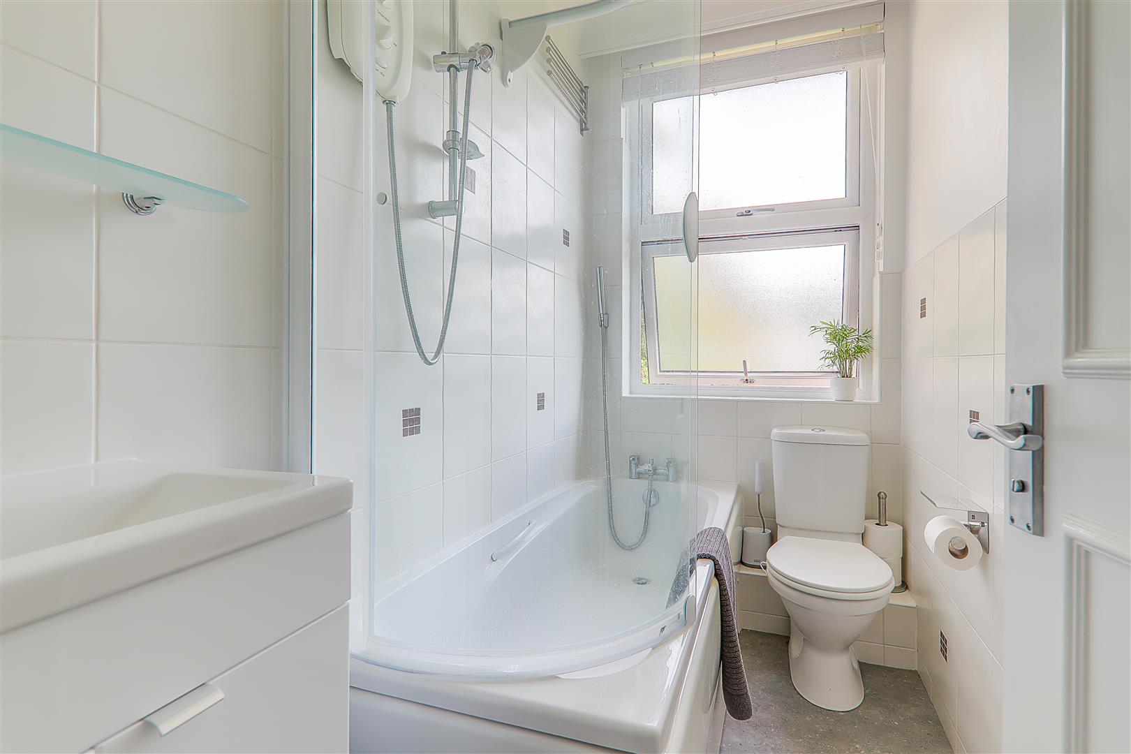 Part tiled walls. Panelled bath with electric shower head above. Low level Wc. Built in vanity sink unit with storage cupboard below. Frosted double glazed window.