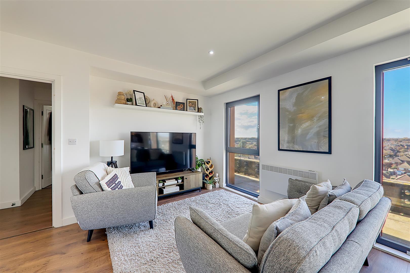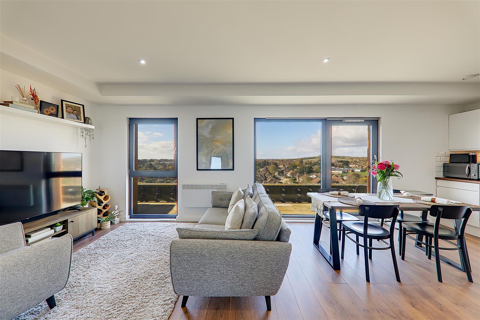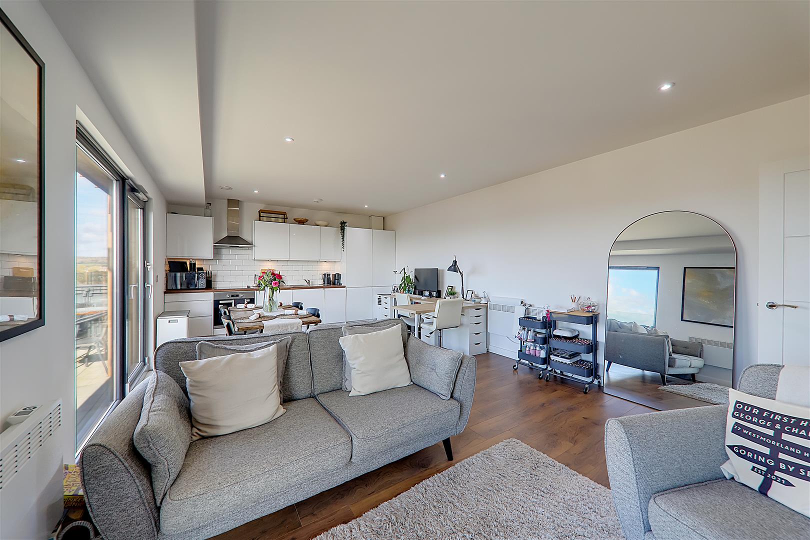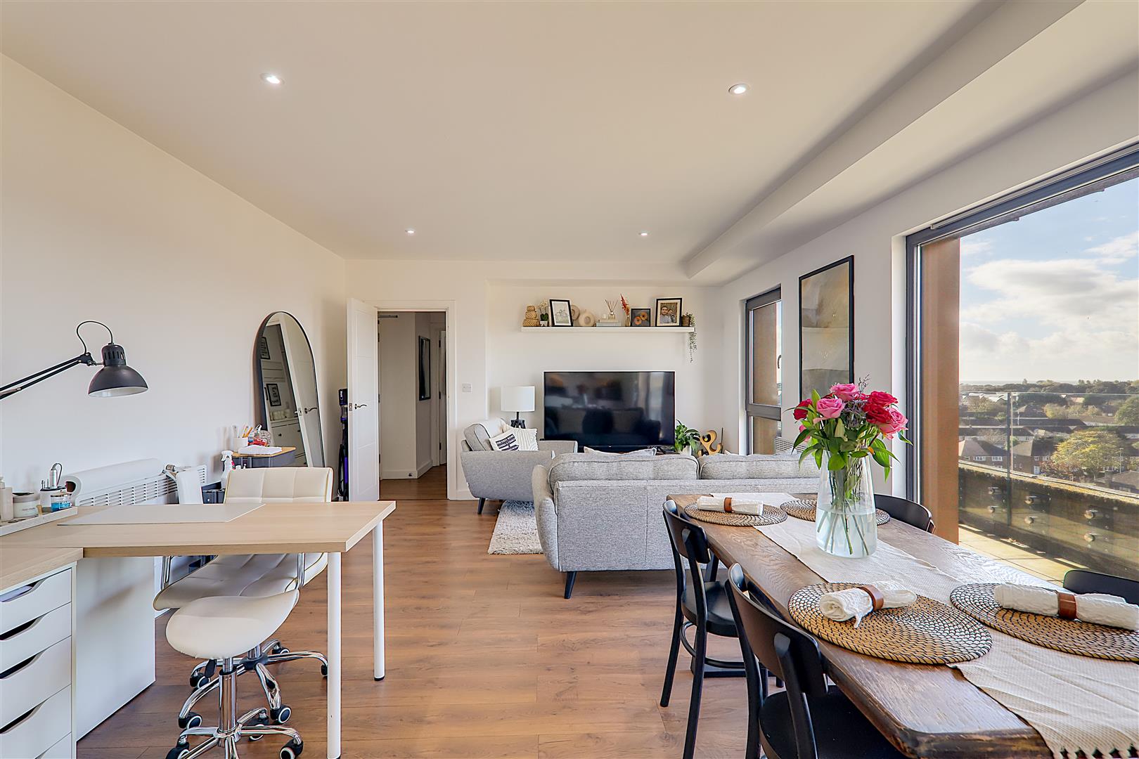 Spacious open plan living room with ample space for a dining table. Electric radiator. TV point. Wood effect flooring. Levelled ceiling. Inset spotlights. Triple glazed windows with sliding door to sun terrace.