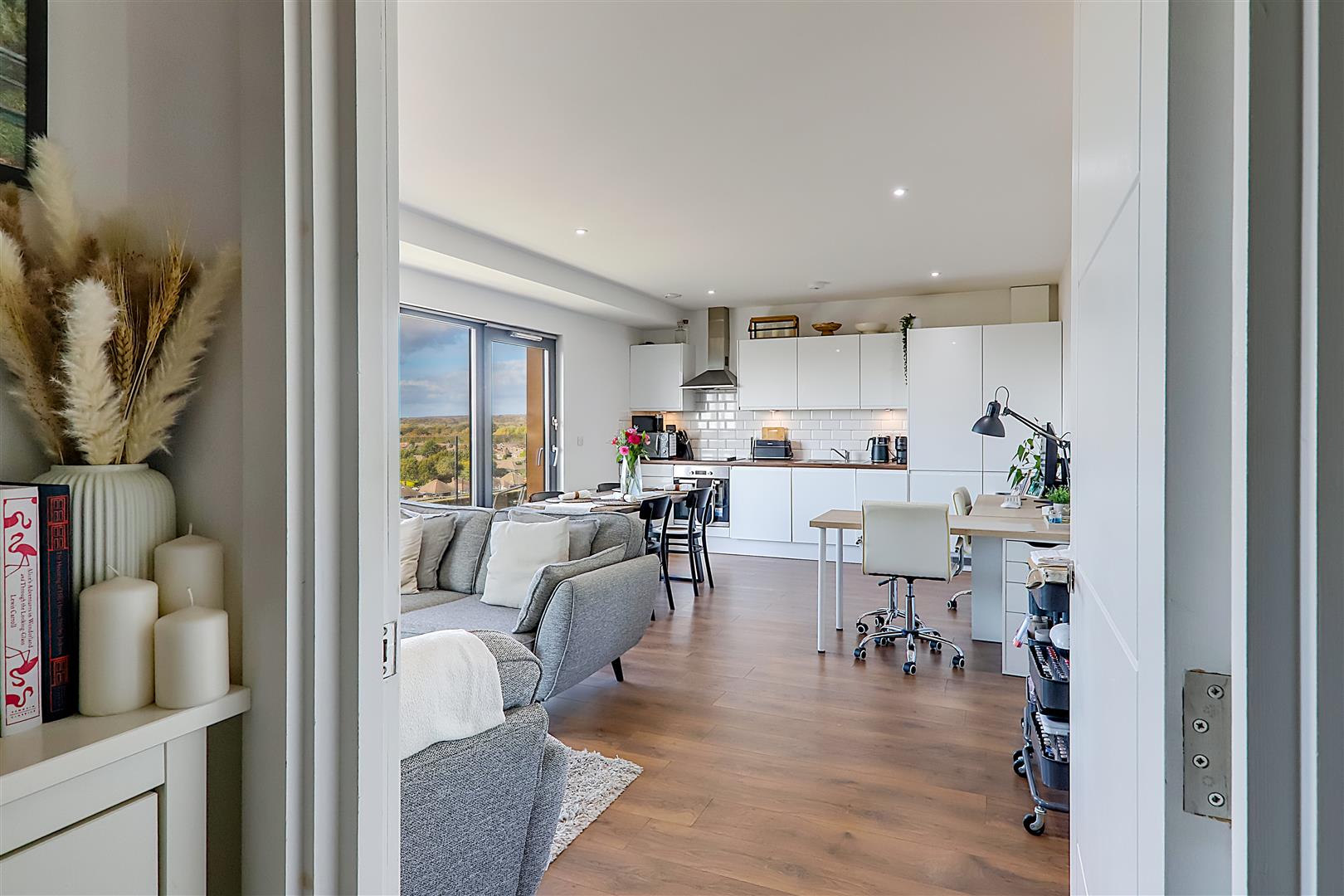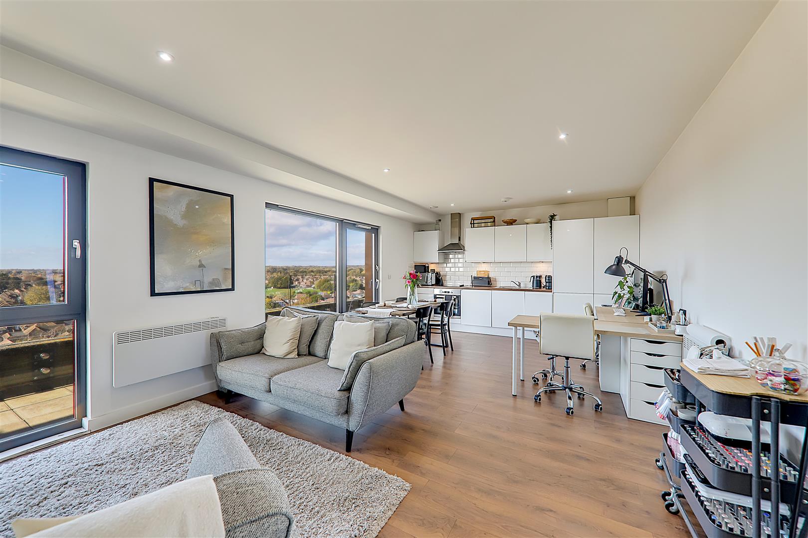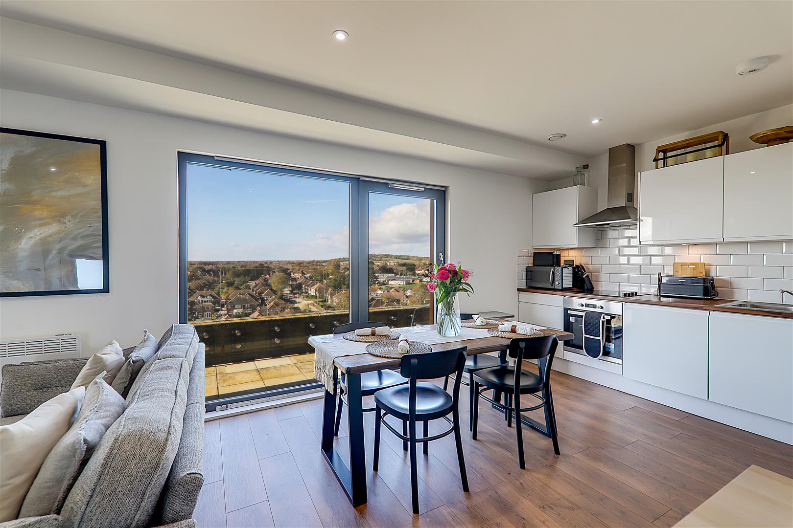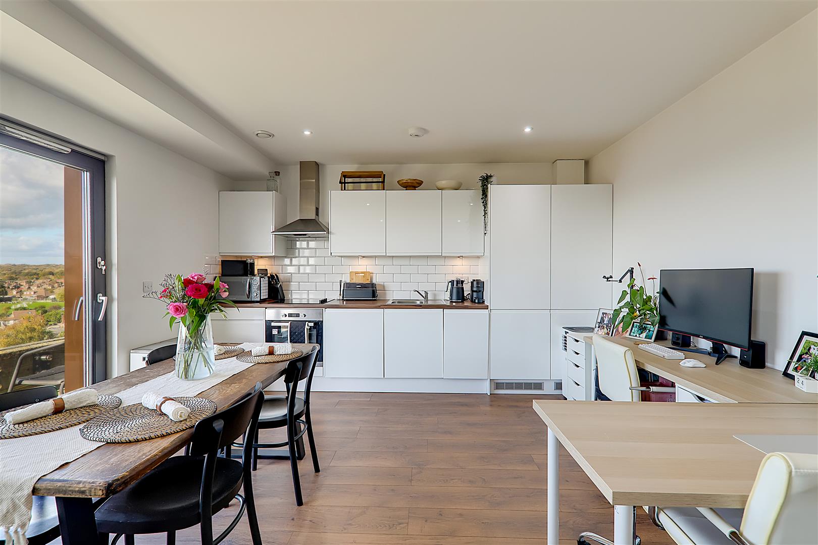 Spacious open plan living room with ample space for a dining table. Electric radiator. TV point. Wood effect flooring. Levelled ceiling. Inset spotlights. Triple glazed windows with sliding door to sun terrace.