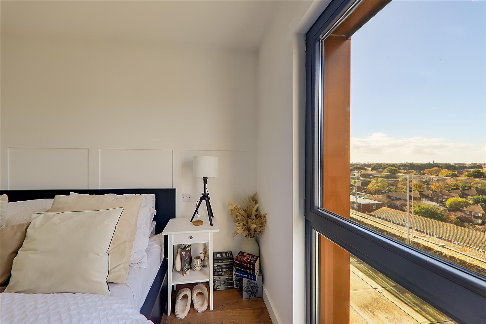 A one bedroom 7th floor PENTHOUSE APARTMENT with panoramic views to the South and West. The property benefits from a generous double bedroom, tiled bathroom, open plan lounge/diner, modern fitted kitchen with integrated appliances, impressive views from all rooms, sliding door leading out onto a spacious west aspect sun terrace. Externally the property offers a covered allocated parking space. Benefits include triple glazed windows, electric heating and long lease. Conveniently located within walking distance to Durrington train station, bus routes and local shops. Viewing is highly recommended to appreciate the overall condition of this home.