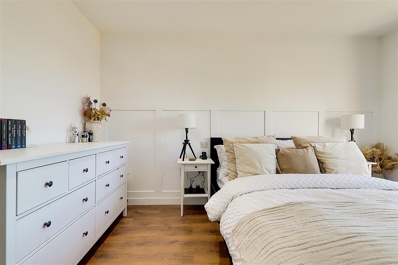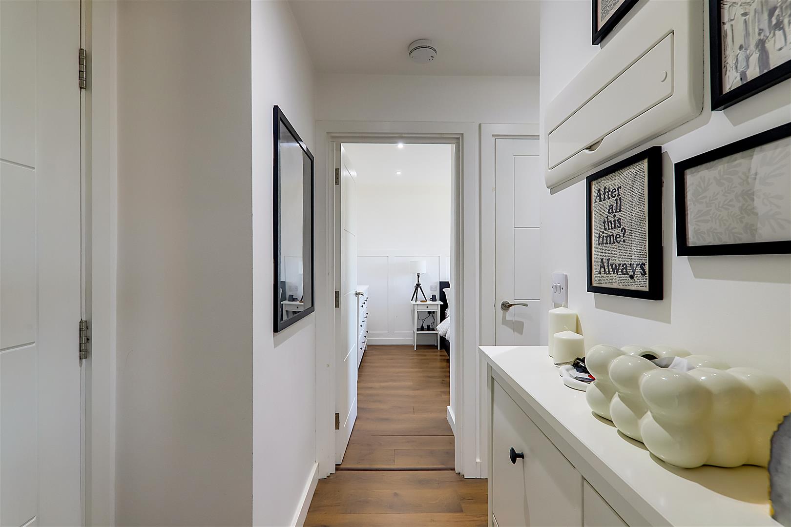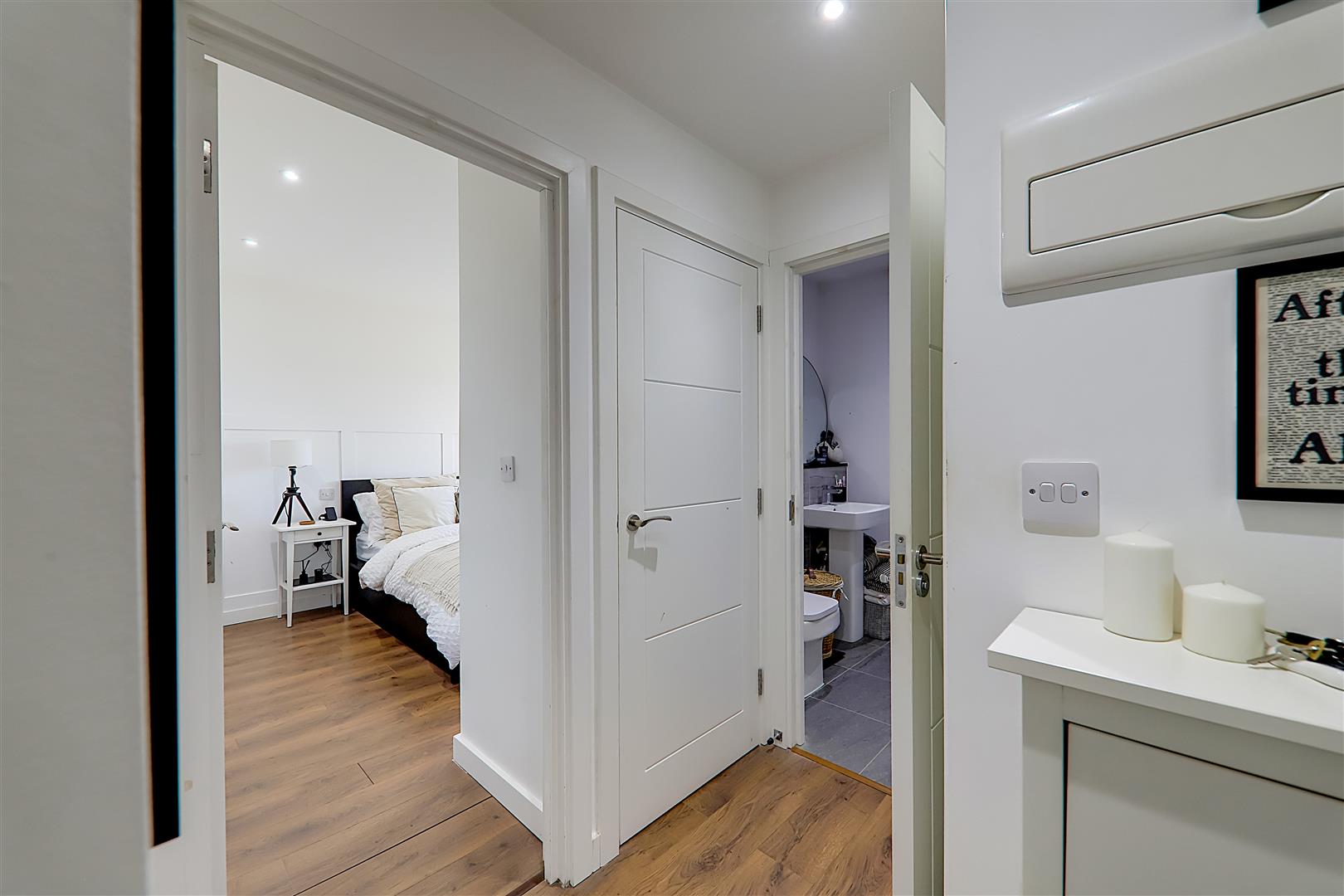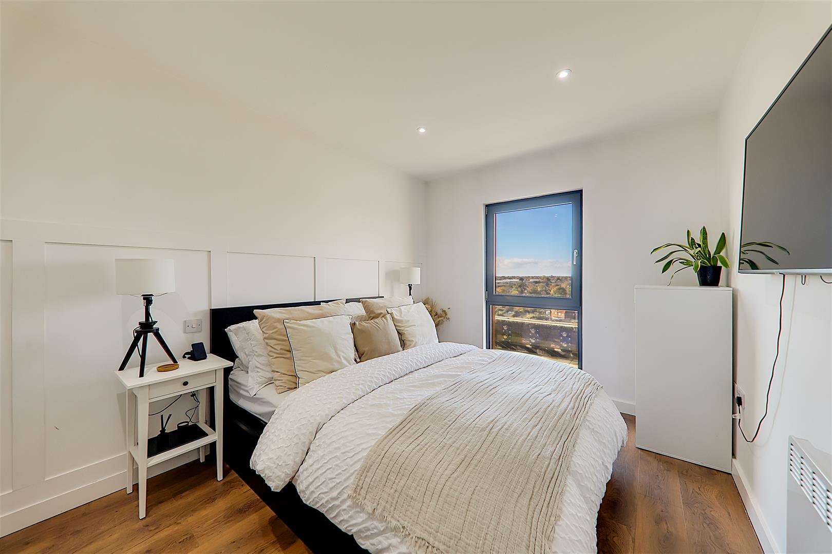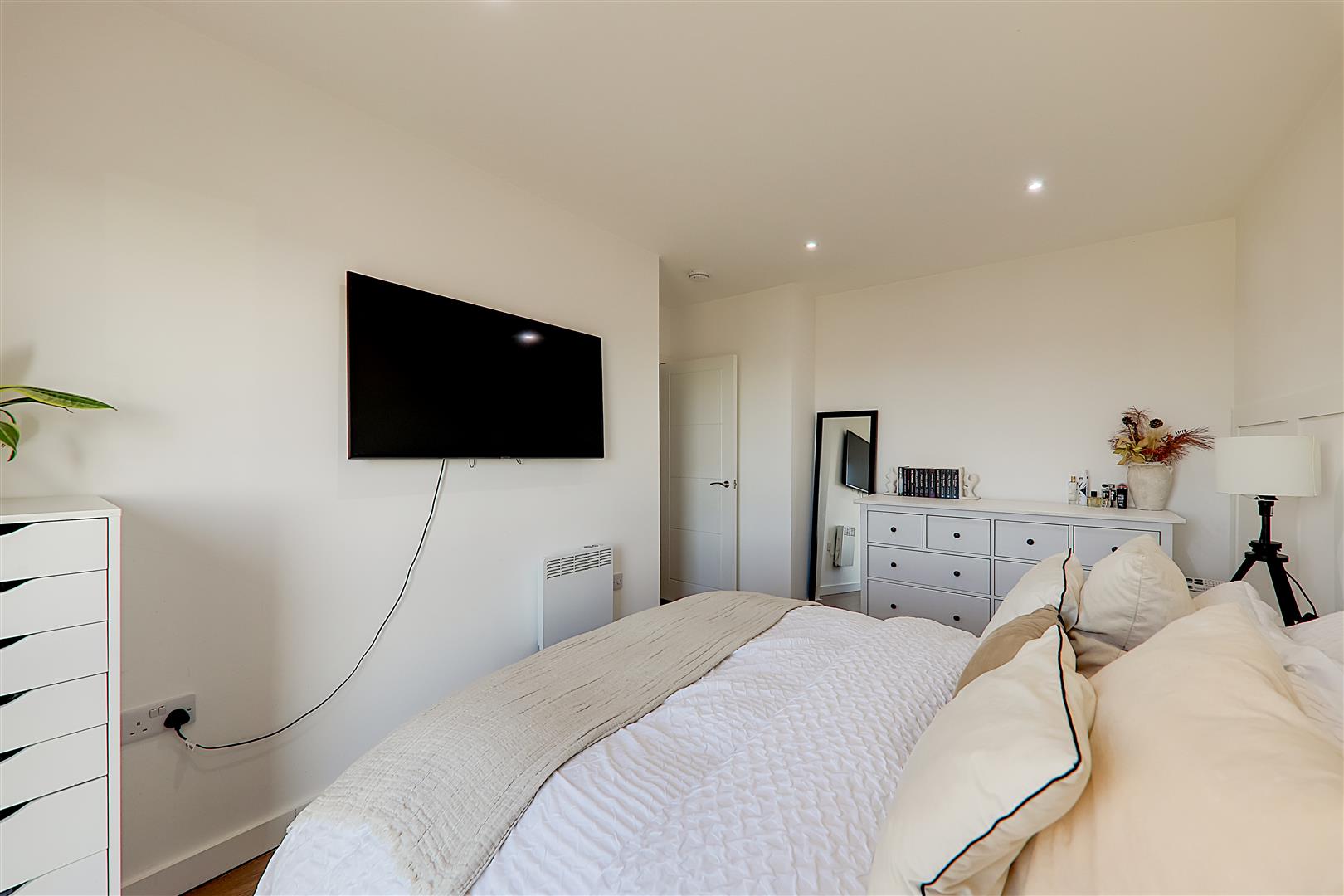 Double bedroom. Triple glazed tilt & turn windows. Electric radiator. TV point. Wood effect flooring. Levelled ceiling. Inset spotlights.