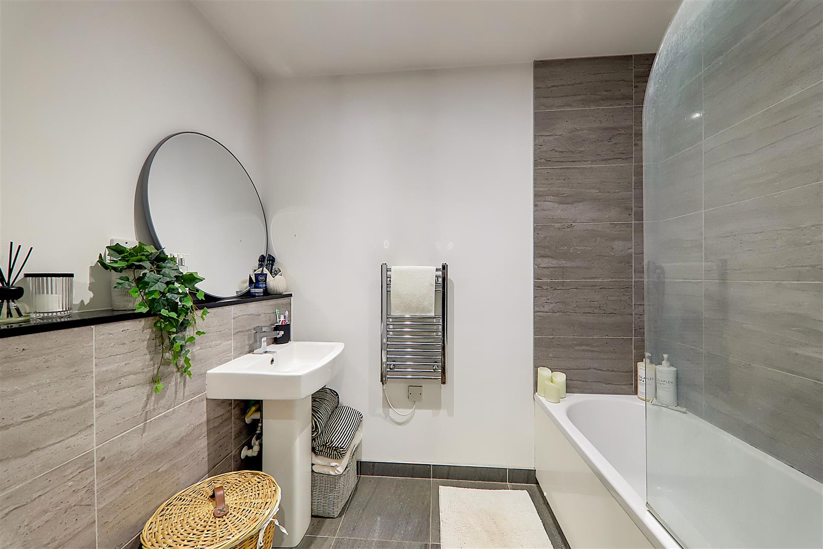 Modern white suite comprising of panelled bath with mixer tap over, wall mounted shower and glass shower screen. Pedestal wash hand basin with stainless steel mixer tap and tiled splashback. Concealed cistern push button w/c. Ladder style towel radiator. Tiled flooring and part tiled walls in grey marble effect tiles. Levelled ceiling. Inset spotlights. Extractor fan.