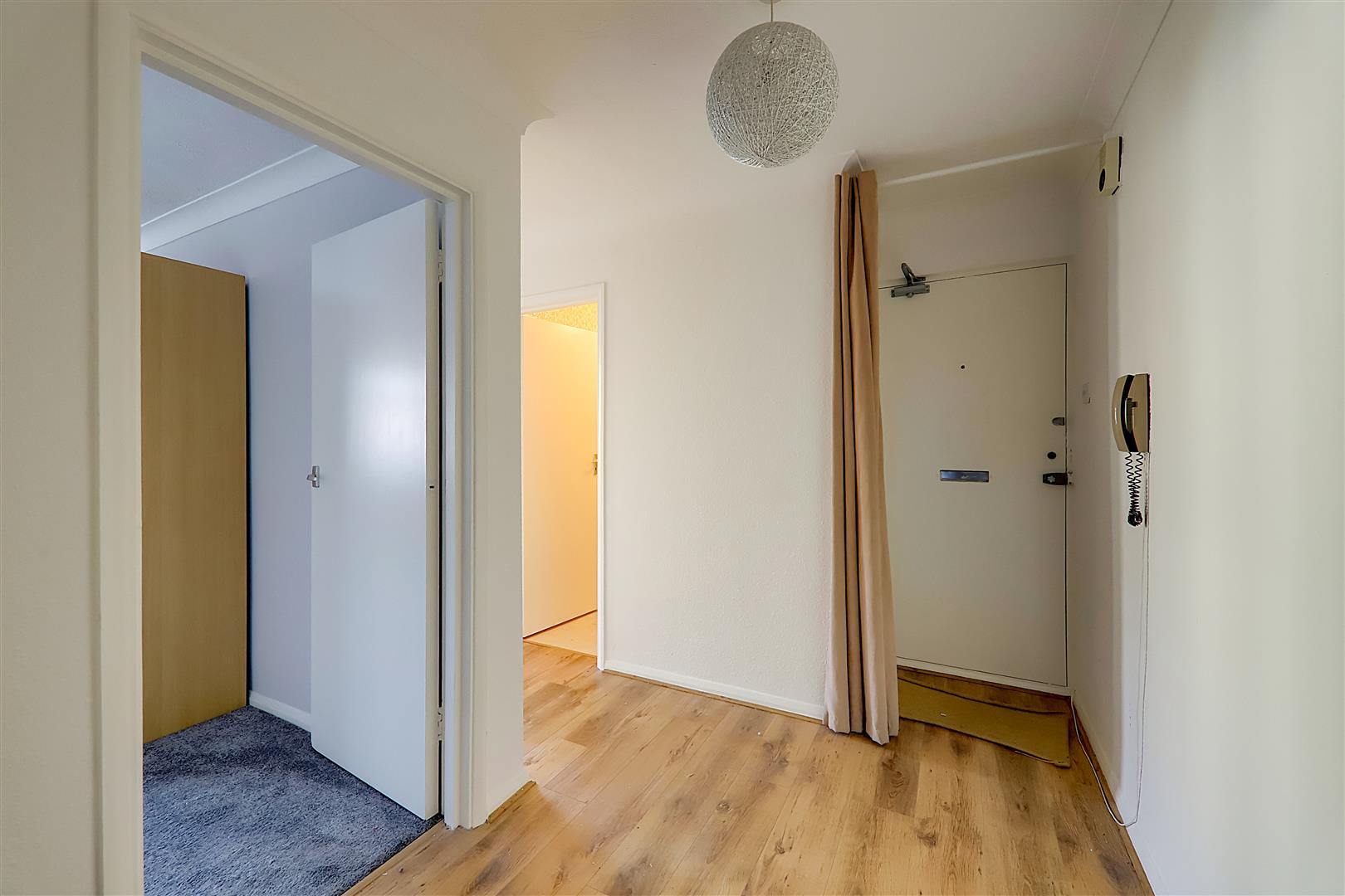 Entryphone. Linen cupboard housing hot water cylinder tank with immersion.
