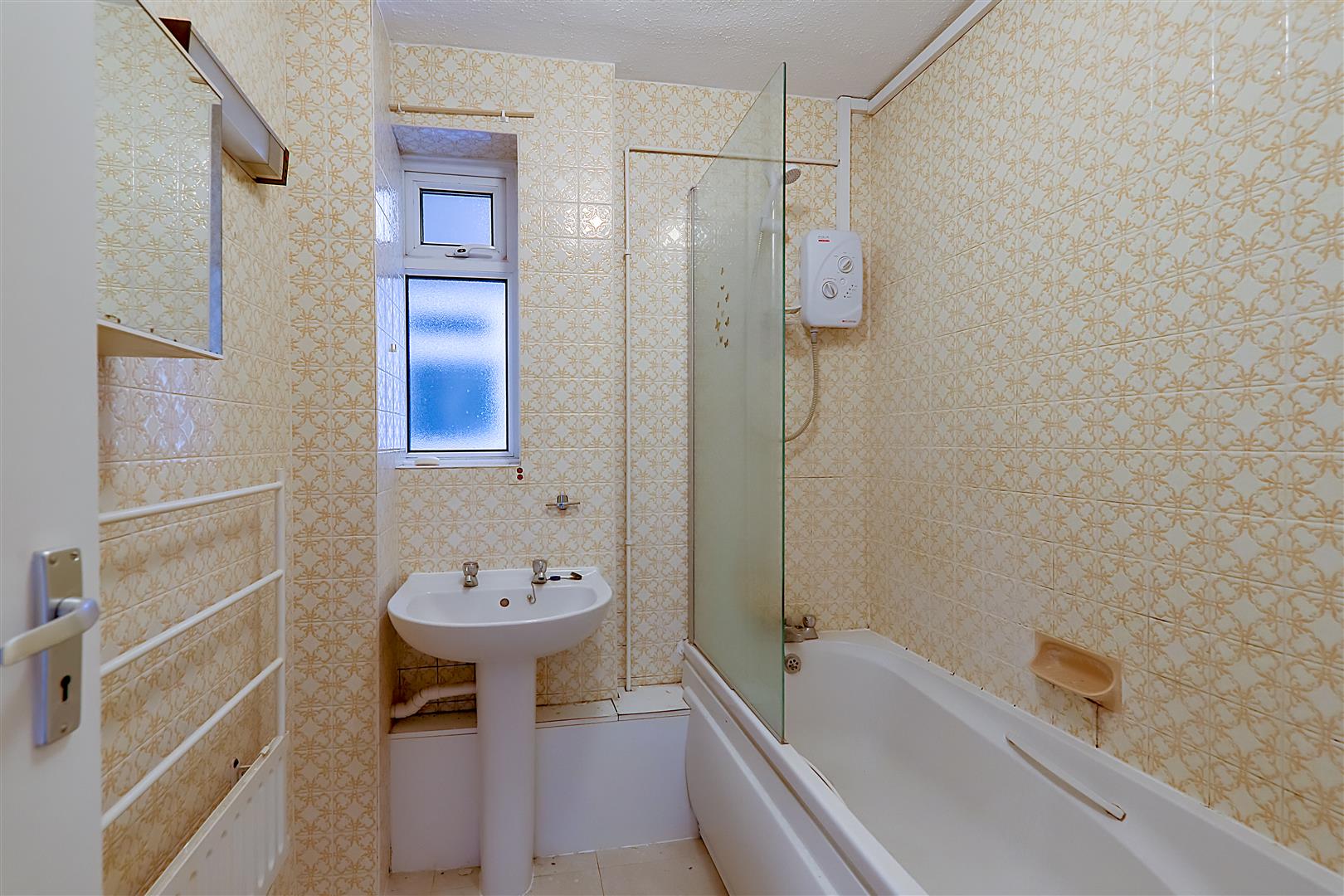 Fully tiled. White suite comprising panelled bath with 'Aqua' electric shower. Pedestal wash hand basin. Strip light with shaver point. Double glazed window.