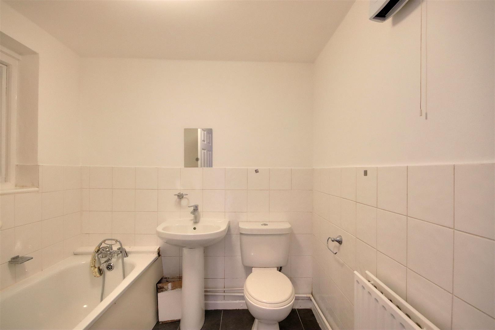 White suite comprising panelled bath with mixer tap and separate handheld shower attachment. Pedestal wash hand basin with mixer tap. Close couple WC./Single glaze window. Radiator.